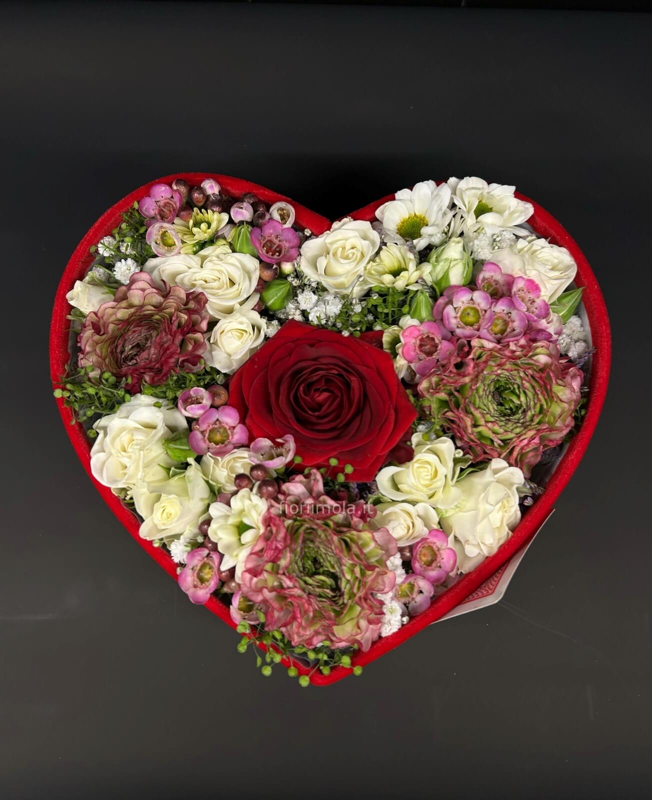 Composizione in scatola a cuore con rose e fiori di stagione, i fiori possono differire dalla foto, per stagionalità e disponibilità di mercato.